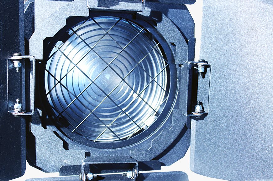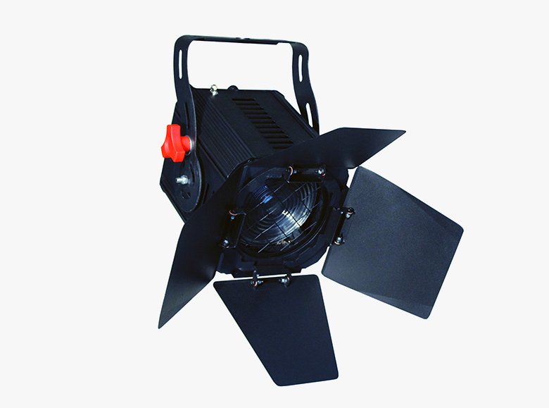Projetor tipo Fresnel para lâmpadas halógenas de 650W ou 1KW (base Gx 9,5). Sua característica é uma projeção de luz difusa e “soft”.